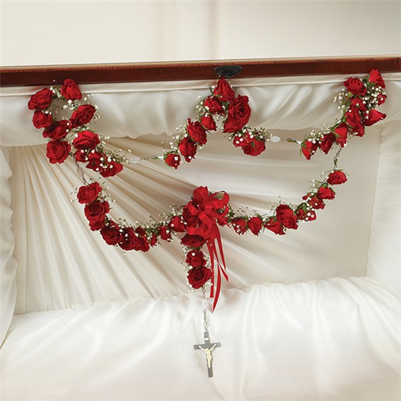 Express the faith, hope and love they inspired with a beautiful ornamental arrangement for the casket. Crafted by our caring florists from a dozen fresh red roses and a string of rosary beads, then accented with baby’s breath and a satin ribbon, this thoughtful adornment is a touching way to celebrate their devotion. •Arrangement of one dozen red spray roses draped around a large string of rosary beads •Measures approximately 40"L •Accented by baby’s breath and finished with a satin ribbon •Appropriate for the funeral home •Our florists use only the freshest flowers available, so colors and varieties may vary