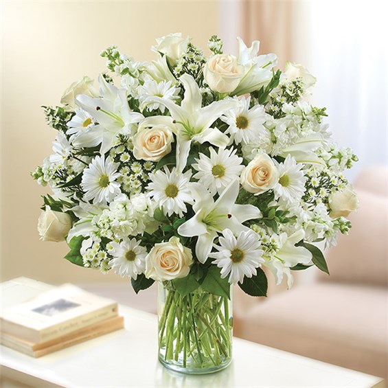 Express your sincere condolences with our elegant all-white arrangement of roses, lilies, stock, daisy poms and monte casino. A peaceful tribute that offers treasured memories of loved ones.• Abundant bouquet of the freshest white roses, lilies, stock, daisy poms and monte casino, accented with variegated pittosporum, salal and myrtle• Hand-designed by our expert florists in a classic glass cylinder vase; vase measures 8"H• Can be sent to the home of friends, family members or business associates, or to the funeral service• Large arrangement measures approximately 24"H x 22"L• Medium arrangement measures approximately 22"H x 20"L• Small arrangement measures approximately 20"H x 18"L• Our florists hand-design each arrangement, so colors, varieties, and container may vary due to local availability • Lilies may arrive in bud form and will open to full beauty over the next 2-3 days