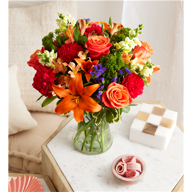 Putting a bright start in somebody’s day starts with a beautiful gift. Our delightfully vibrant bouquet is filled with a medley of blooms in cheerful pops of orange, hot pink and yellow, with plenty of lush greenery mixed in. Designed by the talented Breanna Cartwright from Fresh Ideas Flowers Company in Modesto, California, it’s the perfect pick-me-up surprise, whatever the sentiment.