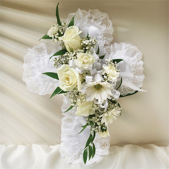 They lived their life with faith and love, which is how one can honor them. Our satin cross casket pillow, fashioned by our expert florists with a spray of pure white roses and white ribbon, is a simple yet elegant arrangement and a touching ornamental gesture. •Cross-shaped satin casket pillow is adorned with a spray of white roses, baby’s breath, ribbon and soft, lush greenery •Measures approximately 9ā€L x 9ā€W •Appropriate for the funeral home •Our florists use only the freshest flowers available, so colors and varieties may vary